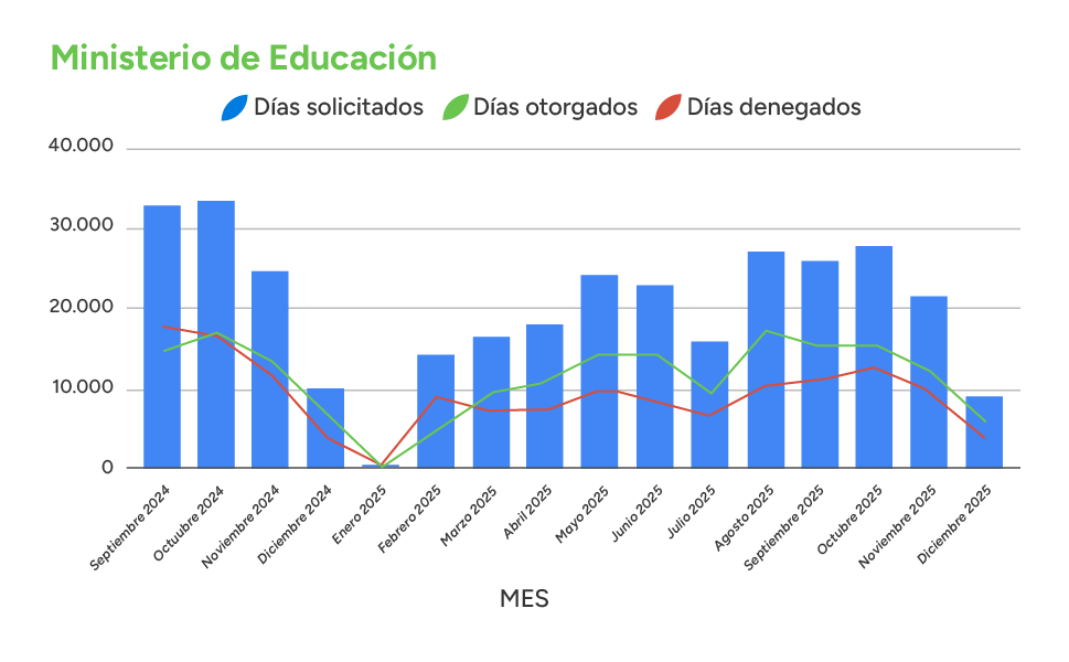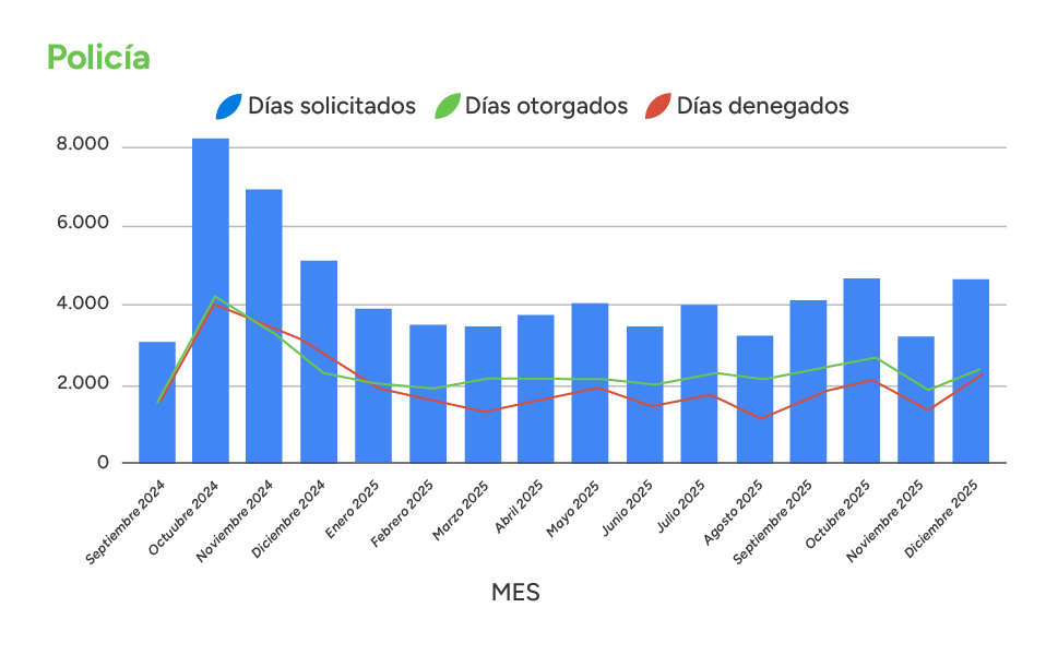 En el período analizado desde la implementación de las auditorías (septiembre de 2024 a diciembre de 2025), se procesaron miles de solicitudes. En total, se pidieron 608.493 días de licencia, de los cuales la auditoría denegó 274.616 días (un 45,13%) que presentaron inconsistencias o no cumplían con los criterios médicos para su otorgamiento total.