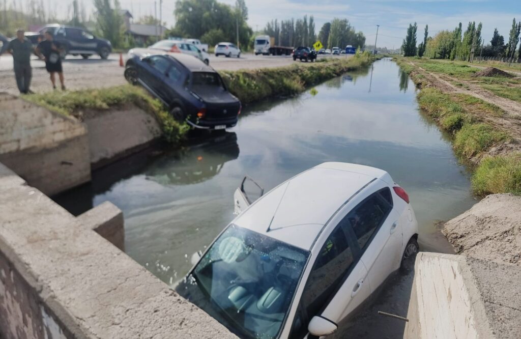 El siniestro ocurrió en el ingreso a calle Santa Cruz, en Cipolletti. Un automóvil cayó dentro de un canal y una camioneta quedó colgando sobre el borde. No hubo personas lesionadas.