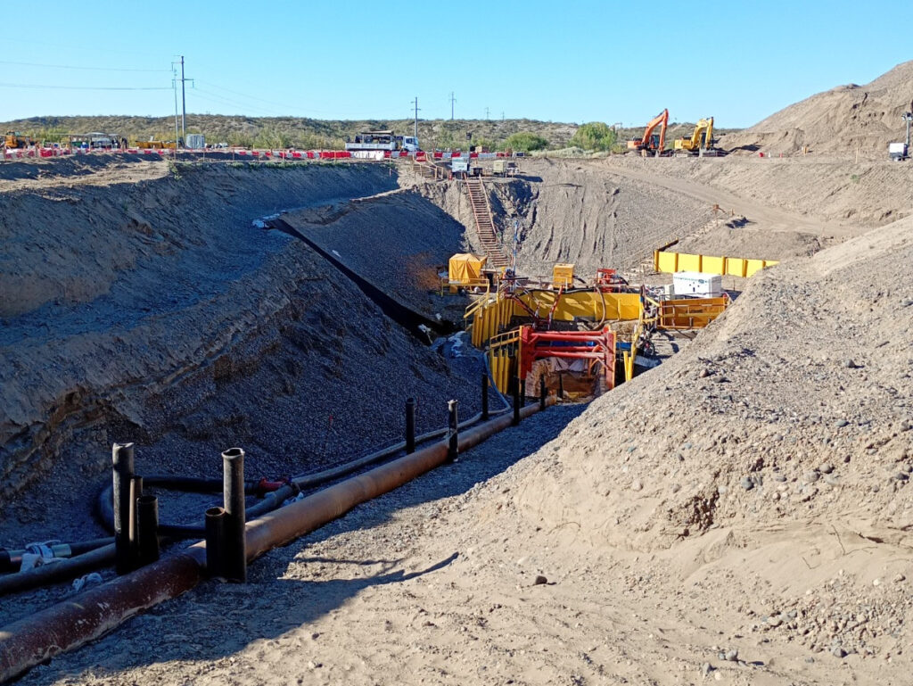 A través del trabajo realizado por el Departamento Provincial de Aguas (DPA), se supervisa la perforación horizontal que permitirá cruzar el ducto a través del cual se transportarán los hidrocarburos de Vaca Muerta hasta la terminal de Punta Colorada para su exportación al mundo.