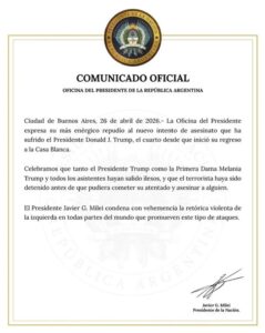 El Gobierno de Javier Milei repudió el intento de atentado contra el presidente de los Estados Unidos, Donald Trump, ocurrido durante la cena de corresponsales de la Casa Blanca en el hotel Hilton en Washington.